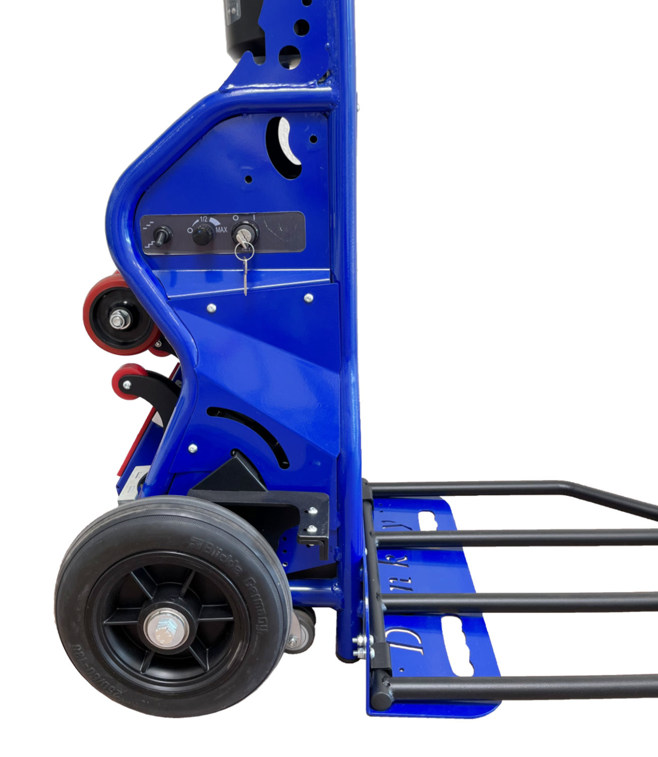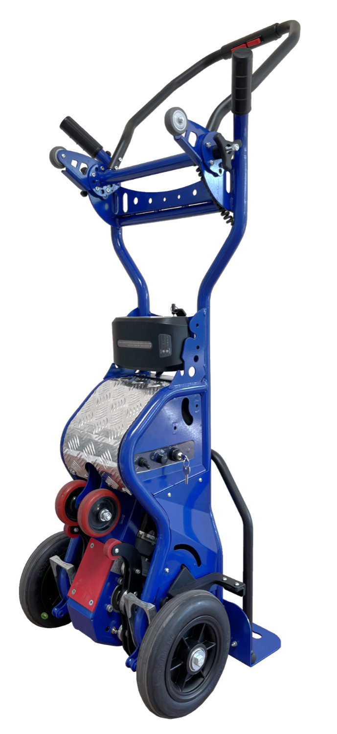 - Sicherer Transport: Das entgegenwirkende Eigengewicht des Geräts minimiert das Kipprisiko und sorgt für sichere Bewegungsabläufe auf der Treppe.