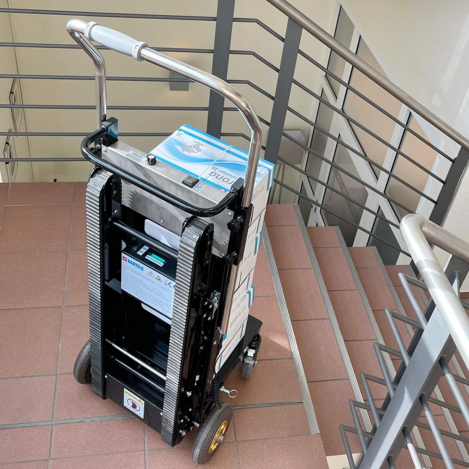 Der elektrische Treppensteiger Bartels Gobi ist die ideale Lösung für den sicheren und effizienten Transport von Lasten bis zu 130 kg. Sein herausragendes Merkmal sind die extra langen Raupen, die auf mindestens drei Stufen gleichzeitig greifen. Dadurch wird 100 % des Gewichts auf die Treppe übertragen, was Ihre Mitarbeiter vollständig entlastet und ein manuelles Balancieren unnötig macht.