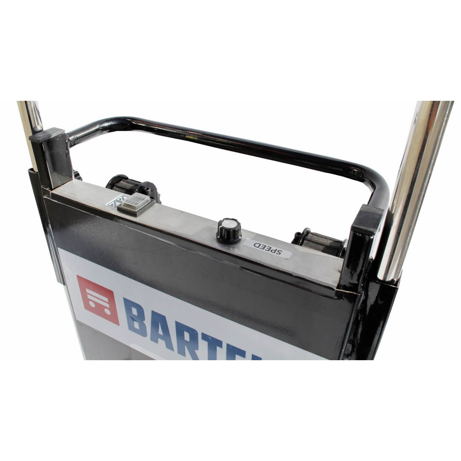 Für den Transport auf ebenen Flächen ist das Gerät mit zusätzlichen Stützrädern unter der Ladefläche ausgestattet, die das Verschieben mühelos machen. Mit dem sanften Anlauf und der einstellbaren Geschwindigkeit haben Sie immer die volle Kontrolle. Der Bartels Gobi ist aus hochfestem Stahl gefertigt und nach IP54 staub- und spritzwassergeschützt, was ihn zu einem robusten und langlebigen Partner macht. Nach Gebrauch lässt sich die Ladefläche einfach einklappen, um Platz zu sparen.