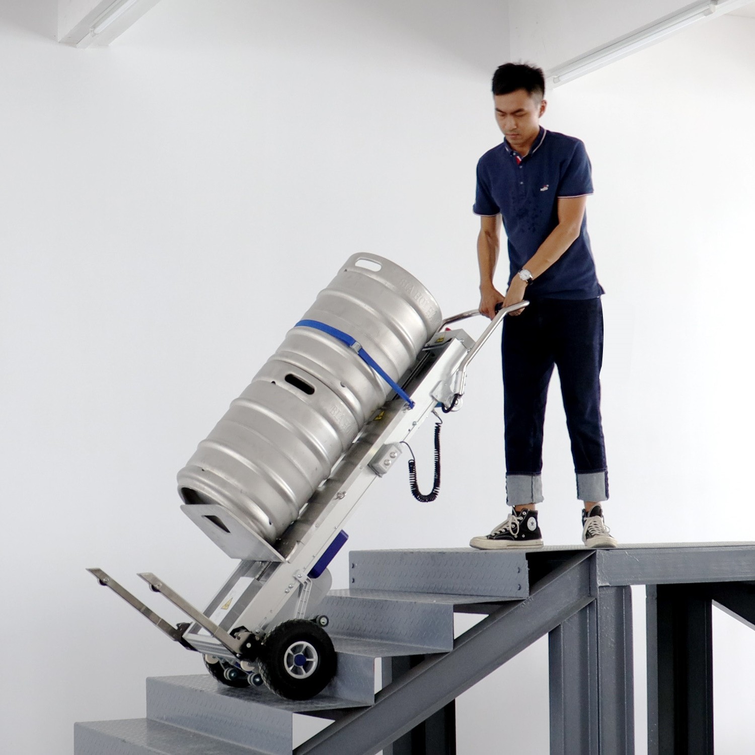 - Integrierter Lift: Hebt die Last für einfaches Be- und Entladen und Drehen auf kleinsten Treppenabsätzen.