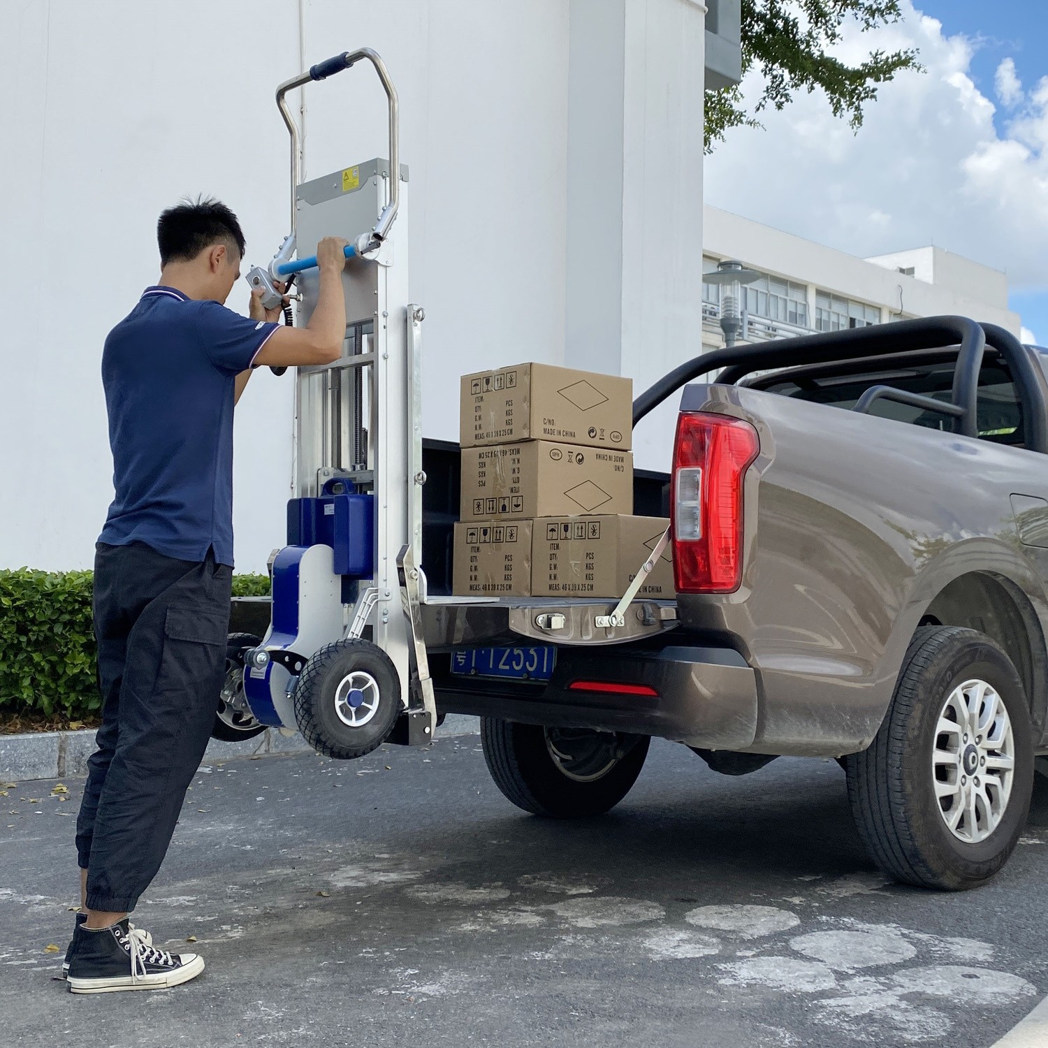 - Einfaches Be- und Entladen: Die Hubautomatik hebt die Plattform selbstständig an, was das Be- und Entladen von Fahrzeugen oder die Aufnahme von Lasten vom Boden erheblich erleichtert.