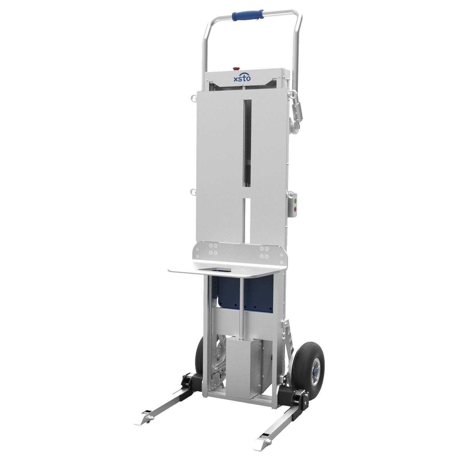 Dank der einklappbaren Stützen mit Rollen wird das Gerät stabilisiert, wenn die Plattform ausgefahren ist. Das ermöglicht nicht nur sicheres Arbeiten, sondern auch das mühelose Drehen auf kleinsten Treppenabsätzen. Die selbstbremsende Spindel bietet zusätzliche Sicherheit bei der Bewegung auf der Treppe, während der verstellbare Handbügel und der Not-Aus-Schalter eine ergonomische und kontrollierte Bedienung gewährleisten. Aus robustem Duraluminium gefertigt und nach IP54 staub- und spritzwassergeschützt, ist der XSTO SCL170A ein zuverlässiger Partner für den täglichen Einsatz.