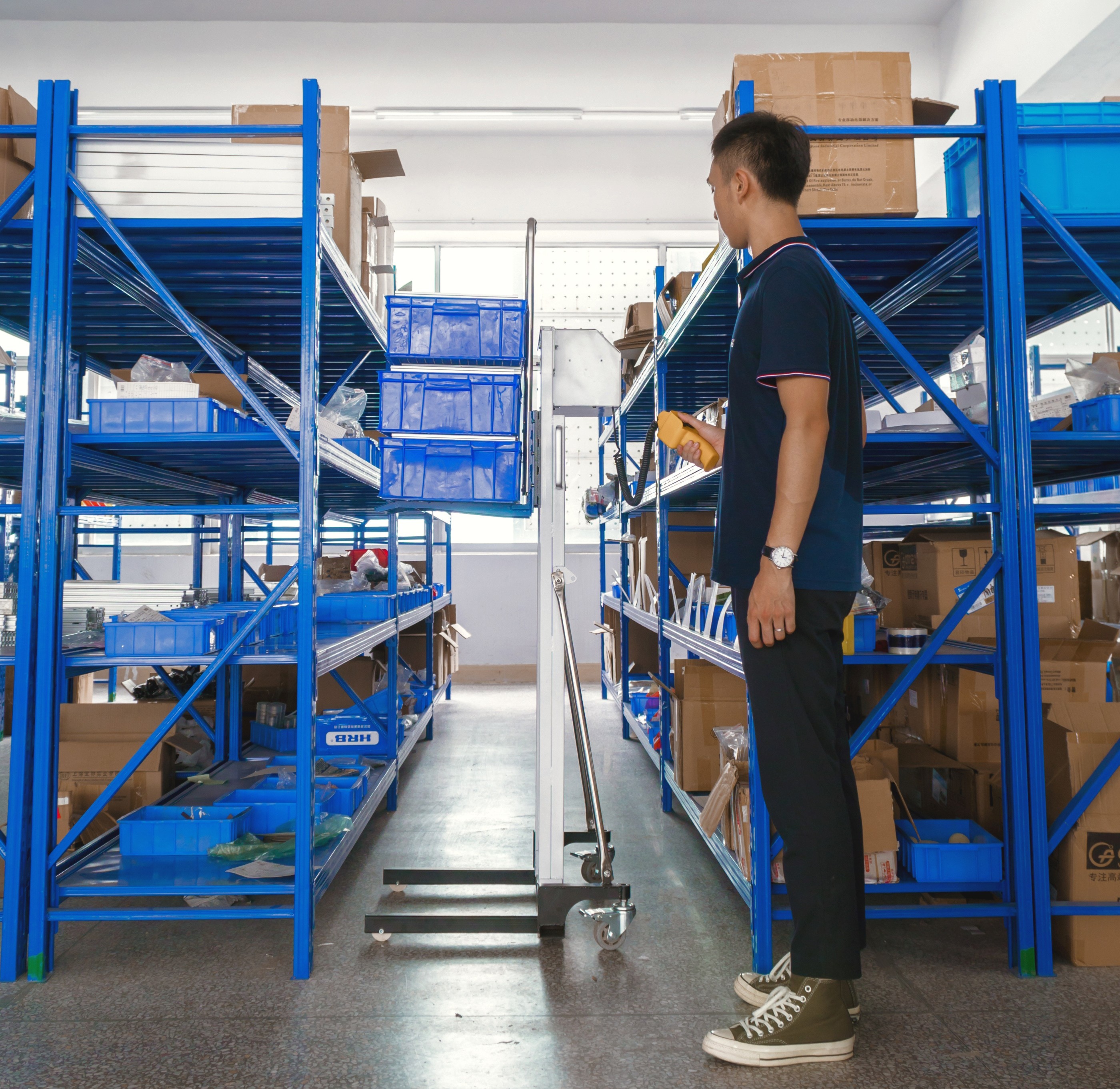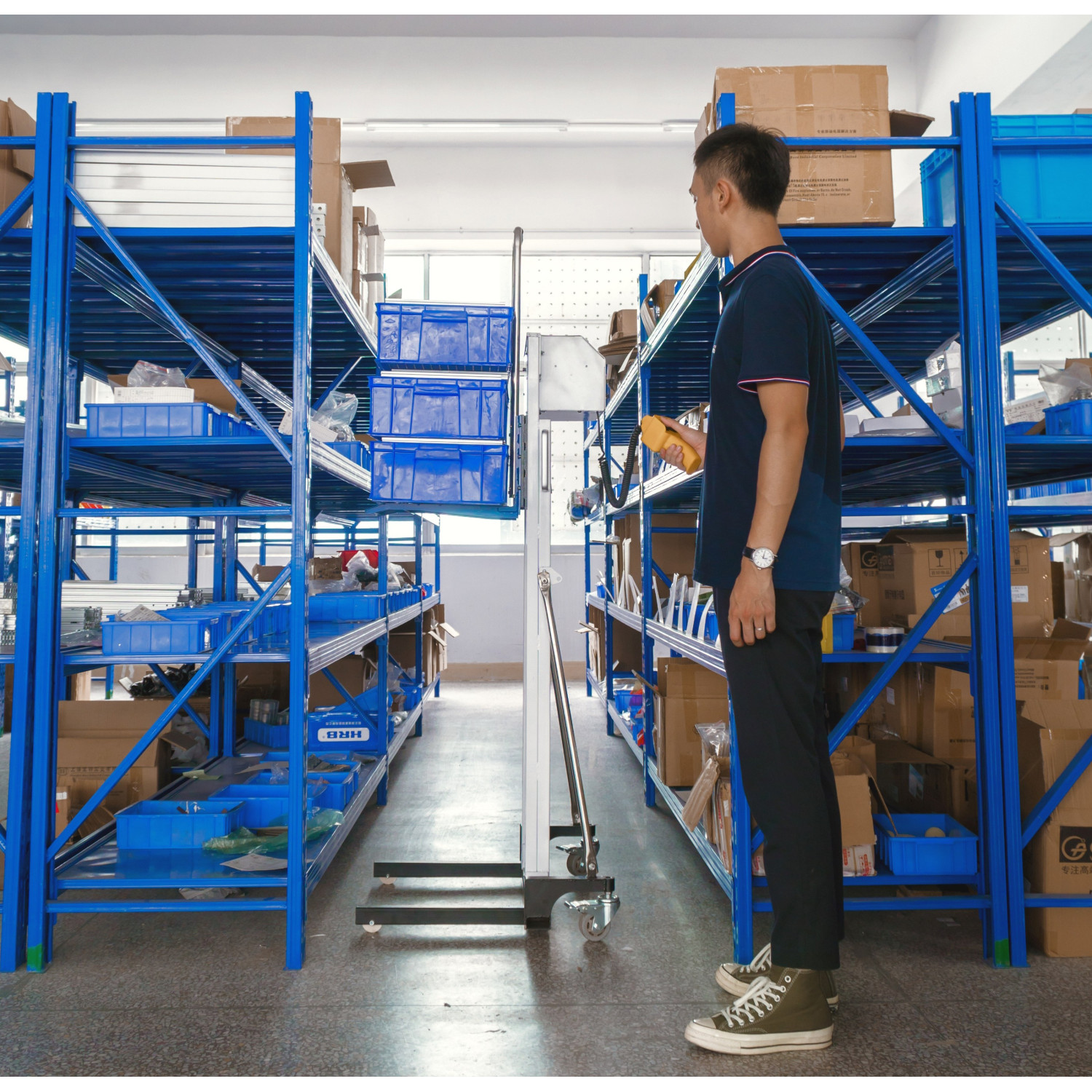- Sicheres Manövrieren: Die einklappbaren Stützen mit Rollen stabilisieren das Gerät, wenn die Hubplattform ausgefahren ist, und ermöglichen das Drehen auf engstem Raum.