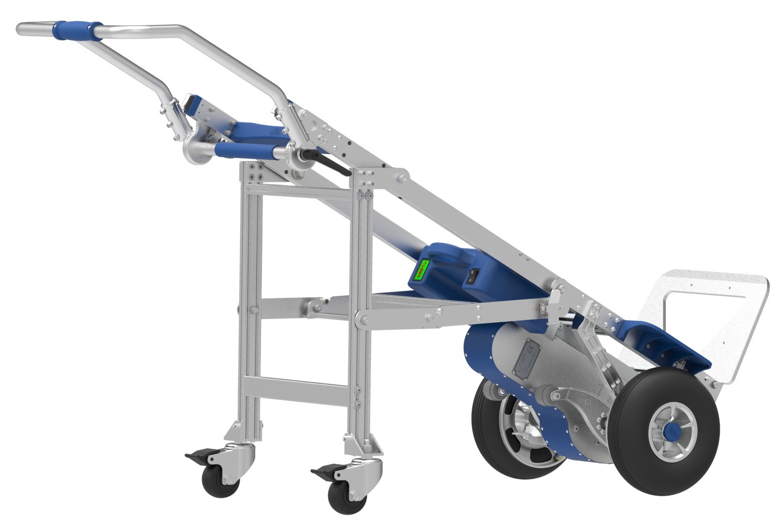Das Transportgestell ermöglicht das Verfahren auf ebenen Flächen ohne händisches Ausgleichen, da die Last über insgesamt 4 Räder auf den Boden übertragen wird. Dank des Klappmechanismus ist das STützfahrgestelle bei Nichtnutzen platzsparend anzuklappen. Das Zubehör ist nachtrüstbar. Passend für alle Treppensteiger XSTO.